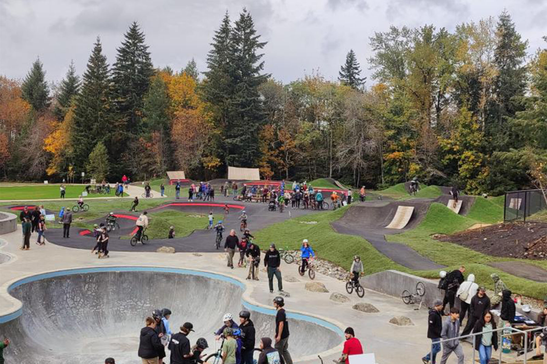 As the premier integrated skatepark, pump track, and jump line in the Pacific Northwest, Cedar Park offers a 20,000 ft² concrete skatepark, matching-size asphalt pump track, and 1,200 ft of jump line seamlessly combined with a walking path, zip-line, climbing rock, slides, swings, and sheltered areas. Designed by Lango Hansen Landscape Architects, the park creates fluid transitions across active and passive recreation zones that serve the Sandy community and regional visitors alike
